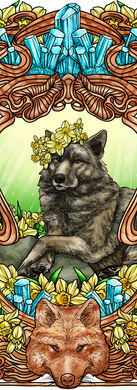 Spring of Wolves showcases the month of March with aquamarine, daffodils and wolves with an Art Nouveau frame.